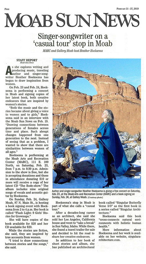 critiques. She produced her first singer songwriter album and toured nationally (2017-2019) with intimate concerts. Her second music album 'My Tessitura' is in progress. Her work on Chaco Canyon is accompanied by a scientific theory titled 'Sineverse Proofs'. Her related talks integrate ideas about natural science, culture, and architectonics translating transcendentally between cosmic and human scales of life.
